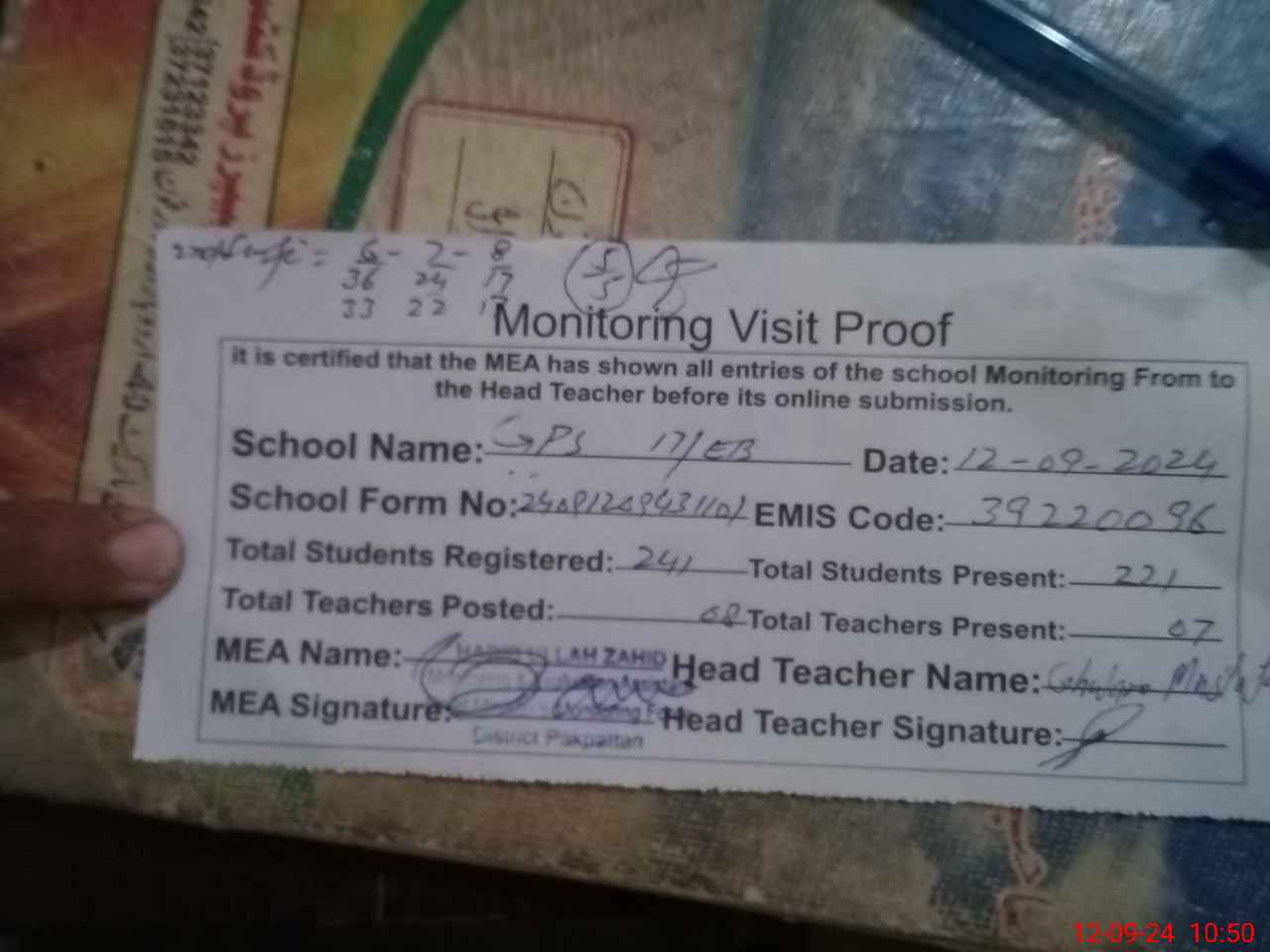 | Attendance Register | Head Teacher | MEA with School | Visit Proof |