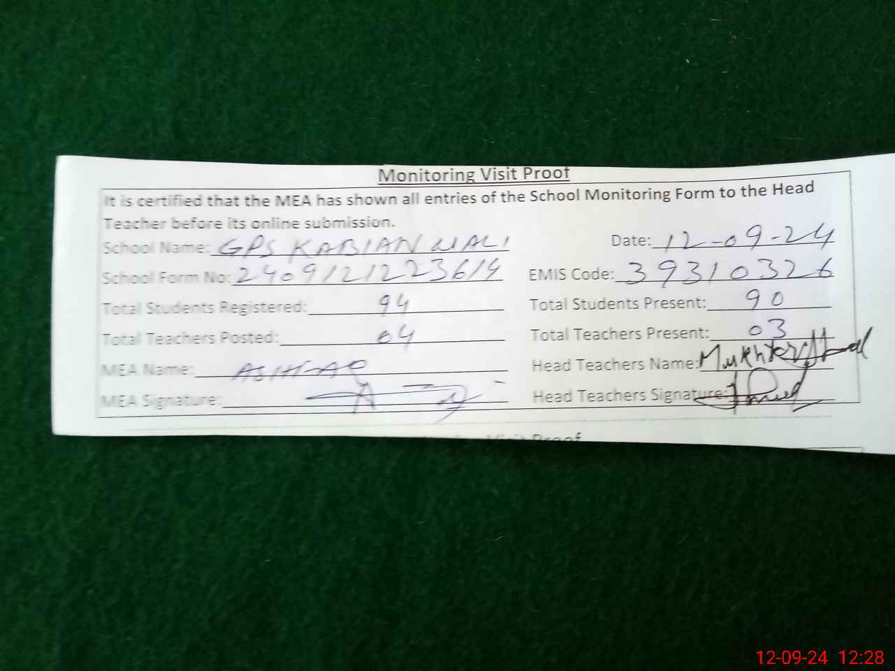 | Attendance Register | Head Teacher | MEA with School | Visit Proof |