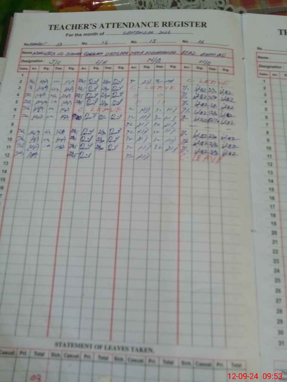 | CNIC | Full Name | Designation | R/C | Absence During Last Calender Month |