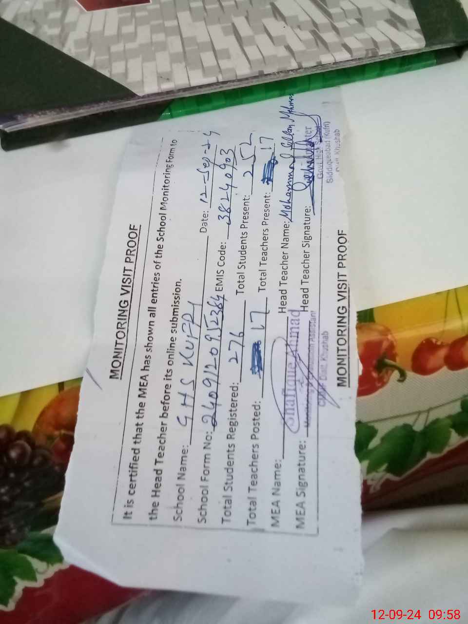 | Attendance Register | Head Teacher | MEA with School | Visit Proof |