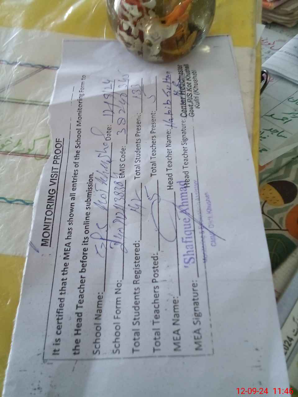 | Attendance Register | Head Teacher | MEA with School | Visit Proof |