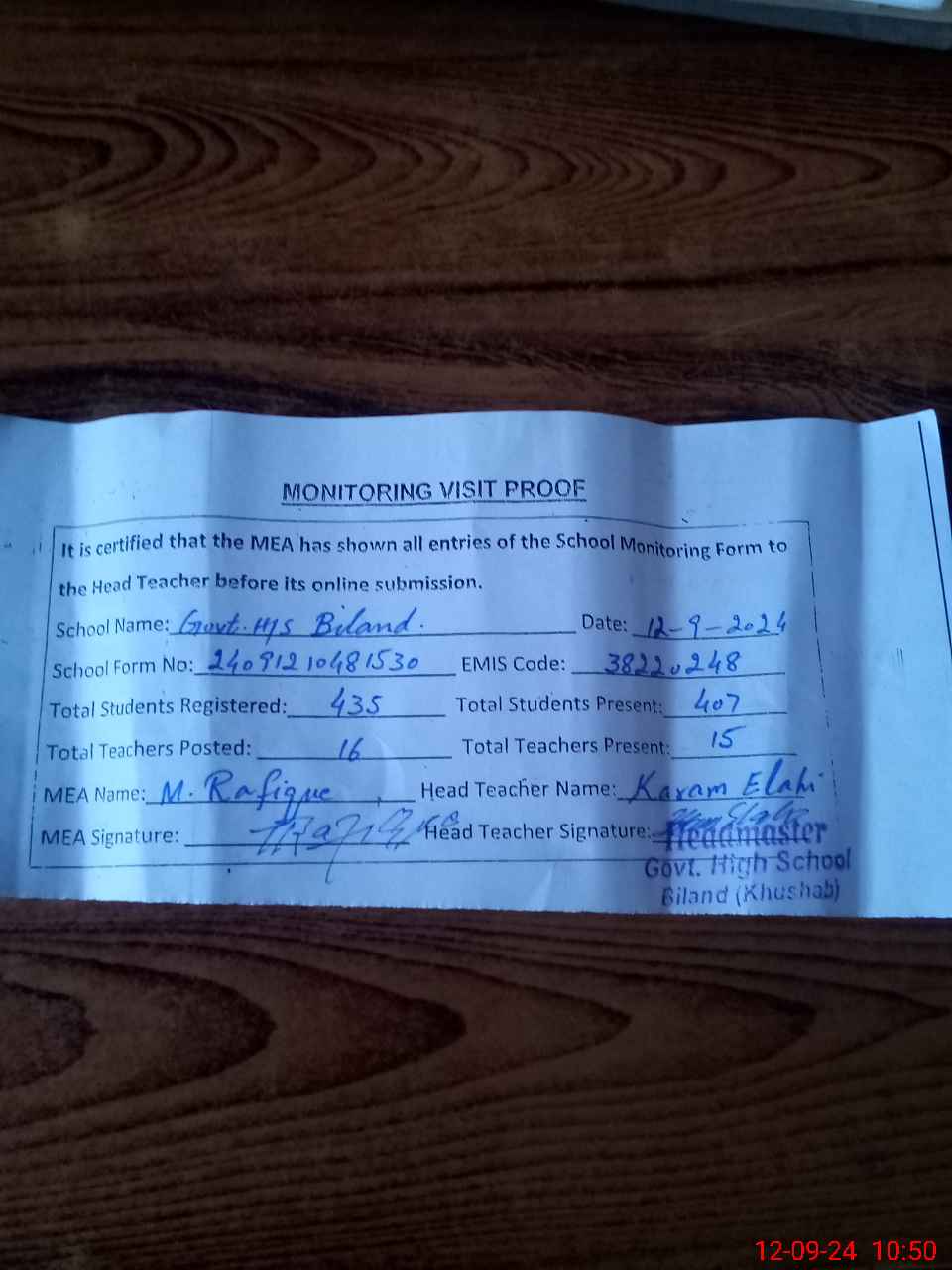| Certified that this School was Inspected by the Undersigned MEA/DMO Today and the Information Stated Above is as Per Record. | |||||