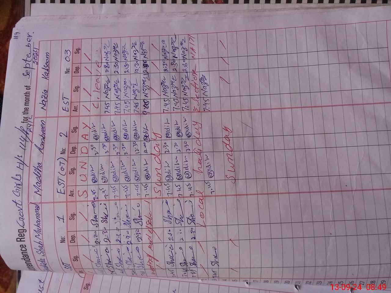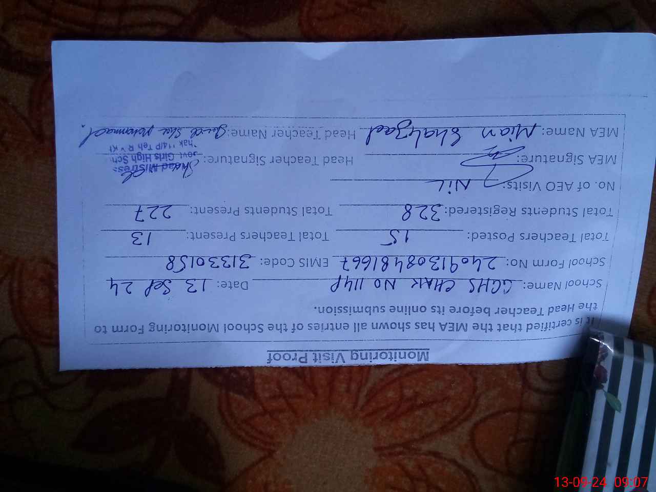 | Monitoring Date: 13-09-2024 | Start Time: 13-09-2024 08:30 AM | End Time: 13-09-2024 09:07 AM | Name of MEA: Sh**** Ah**** | |