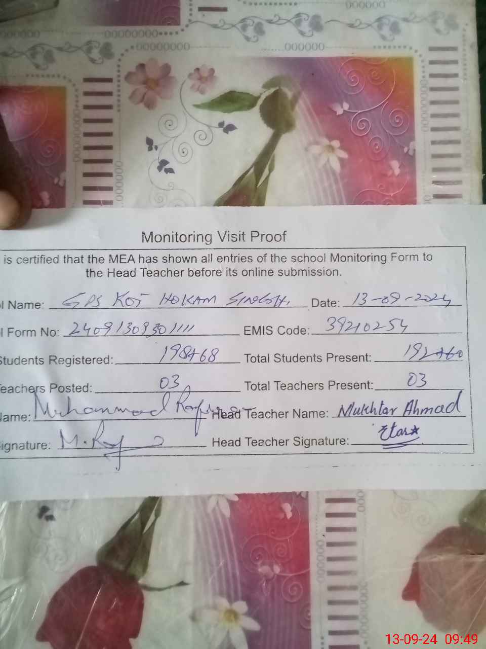 | Certified that this School was Inspected by the Undersigned MEA/DMO Today and the Information Stated Above is as Per Record. | |||||