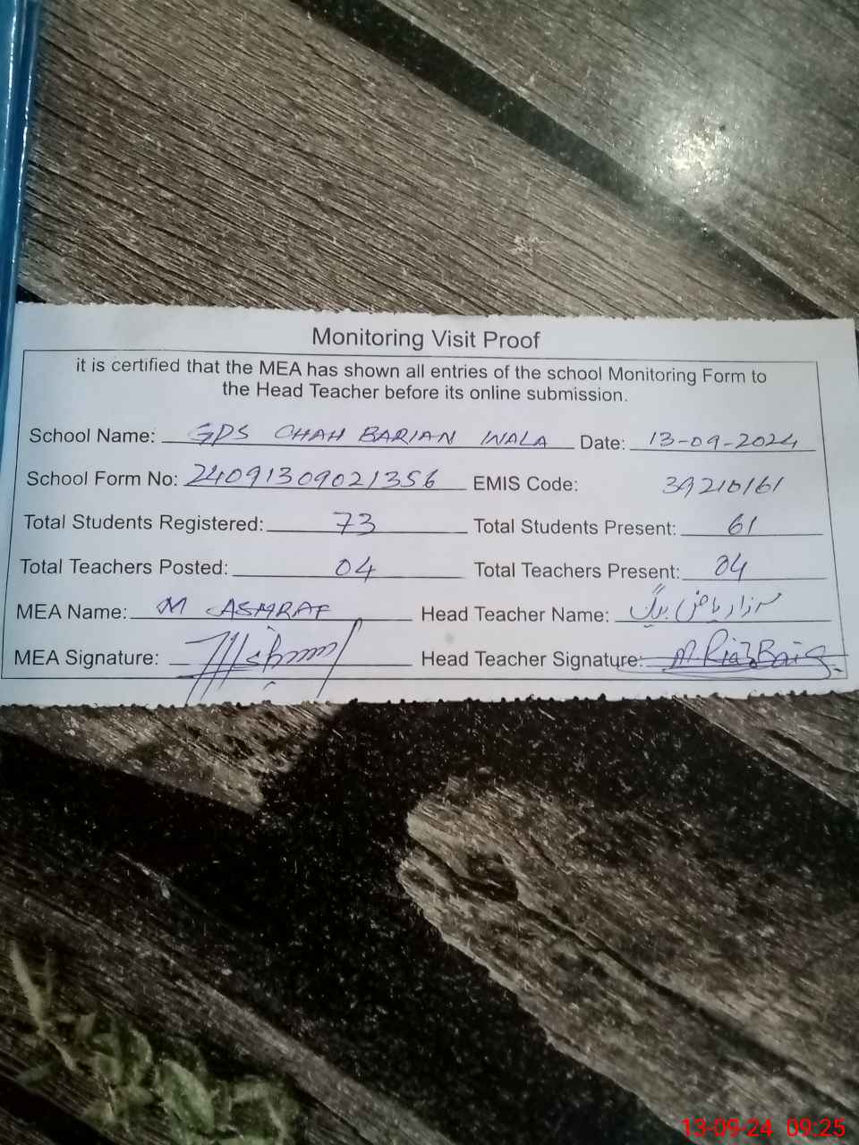 | EMIS Code: 39210161 | Name of School: GPS CHAH BARIAN WALA | |||