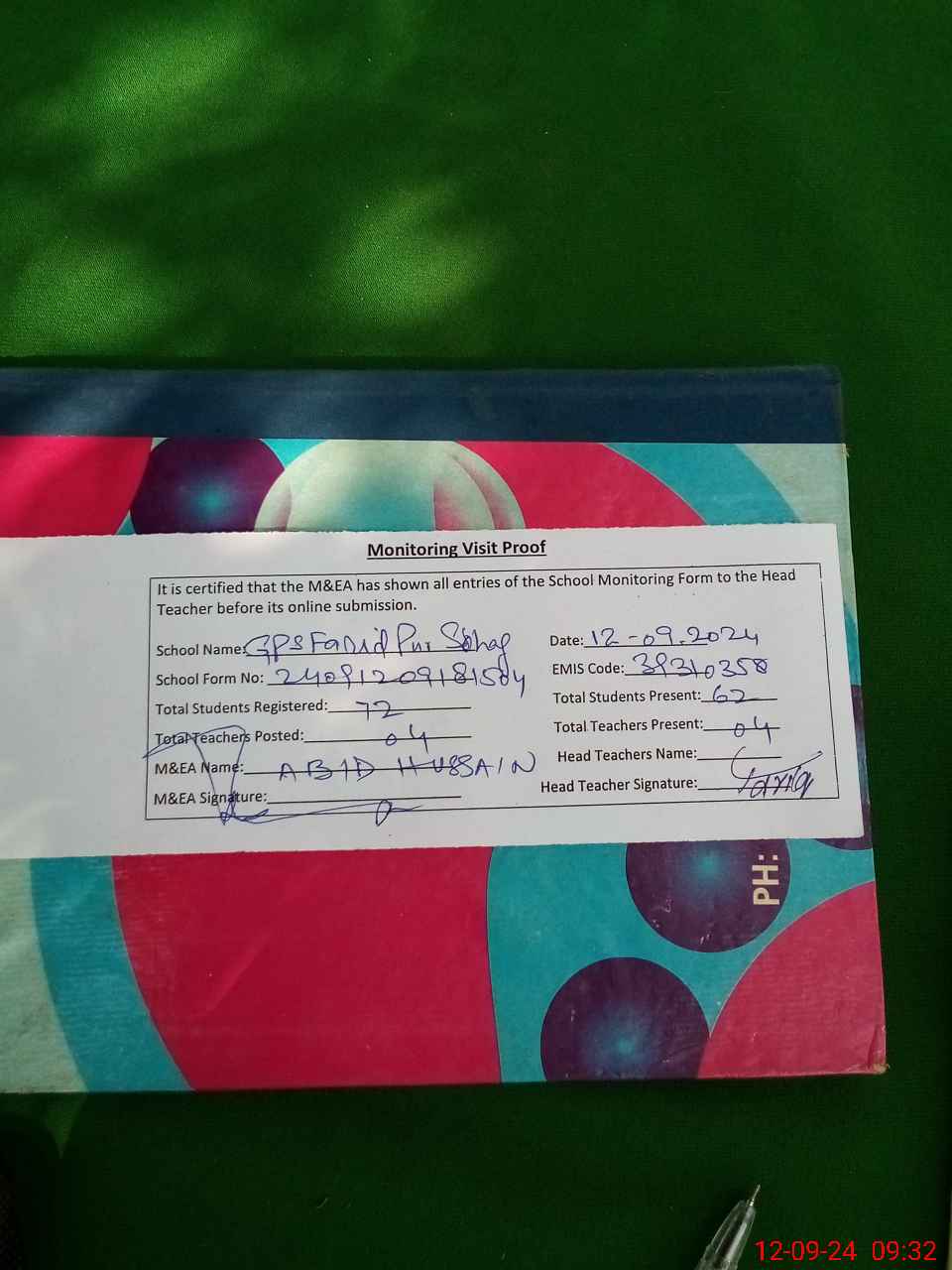 | Attendance Register | Head Teacher | MEA with School | Visit Proof |