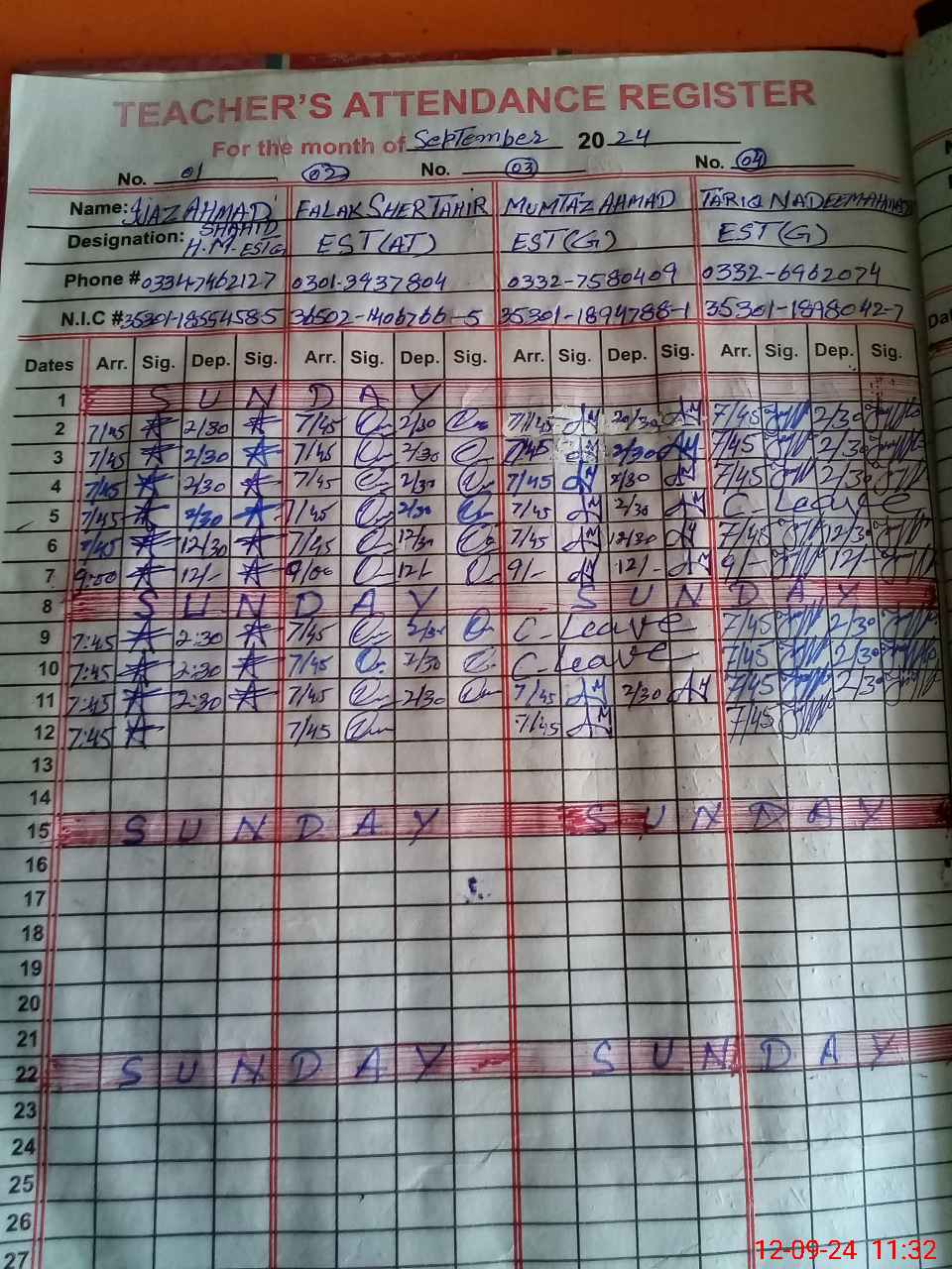 | CNIC | Full Name | Designation | R/C | Absence during last cal. month |