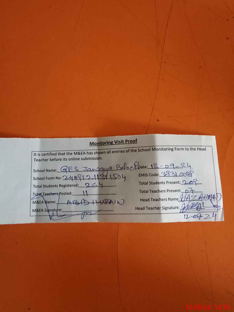 | Attendance Register | Head Teacher | MEA with School | Visit Proof |