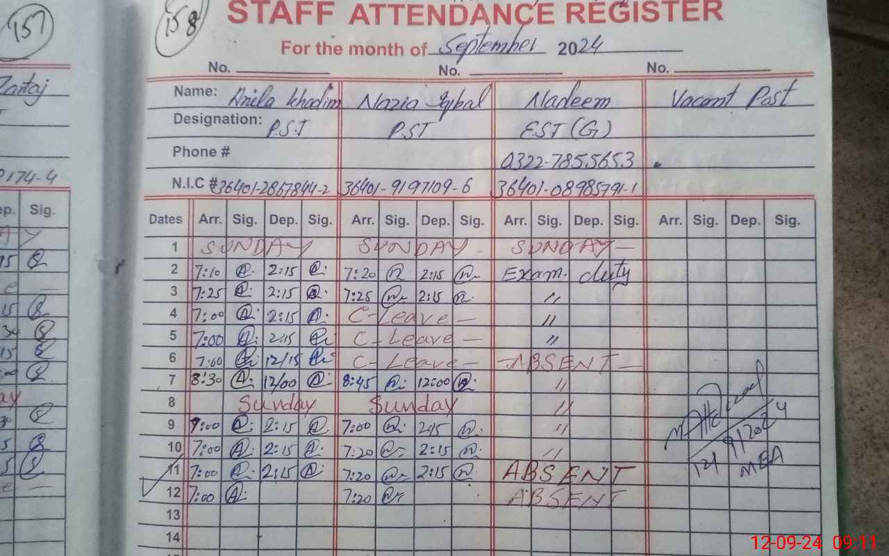 | CNIC | Full Name | Designation | R/C | Absence During Last Calender Month |