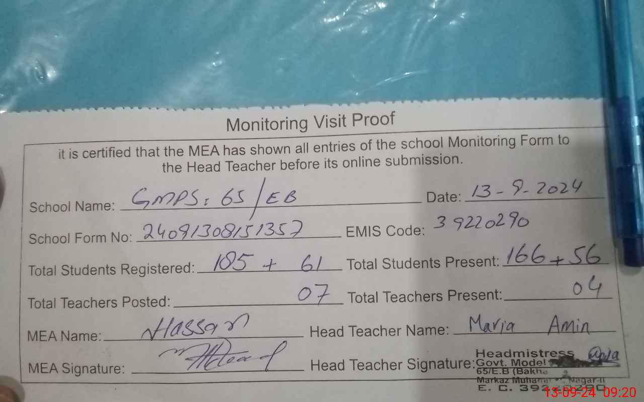 | EMIS Code: 39220290 | Name of School: GMPS 65 EB BAKHA P/O ARIFWALA PAKPATTAN | |||