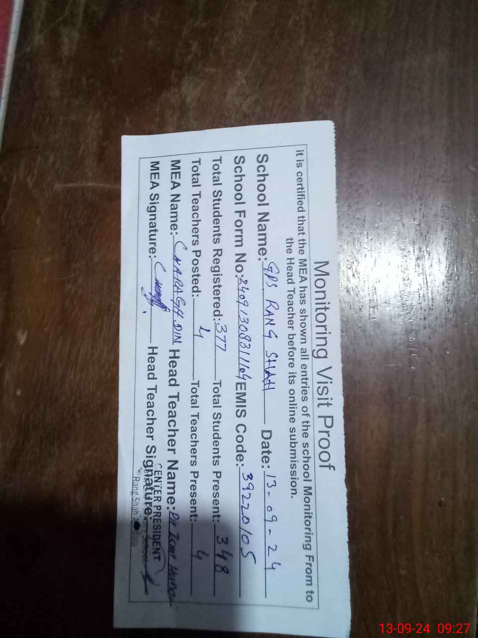 | Attendance Register | Head Teacher | MEA with School | Visit Proof |