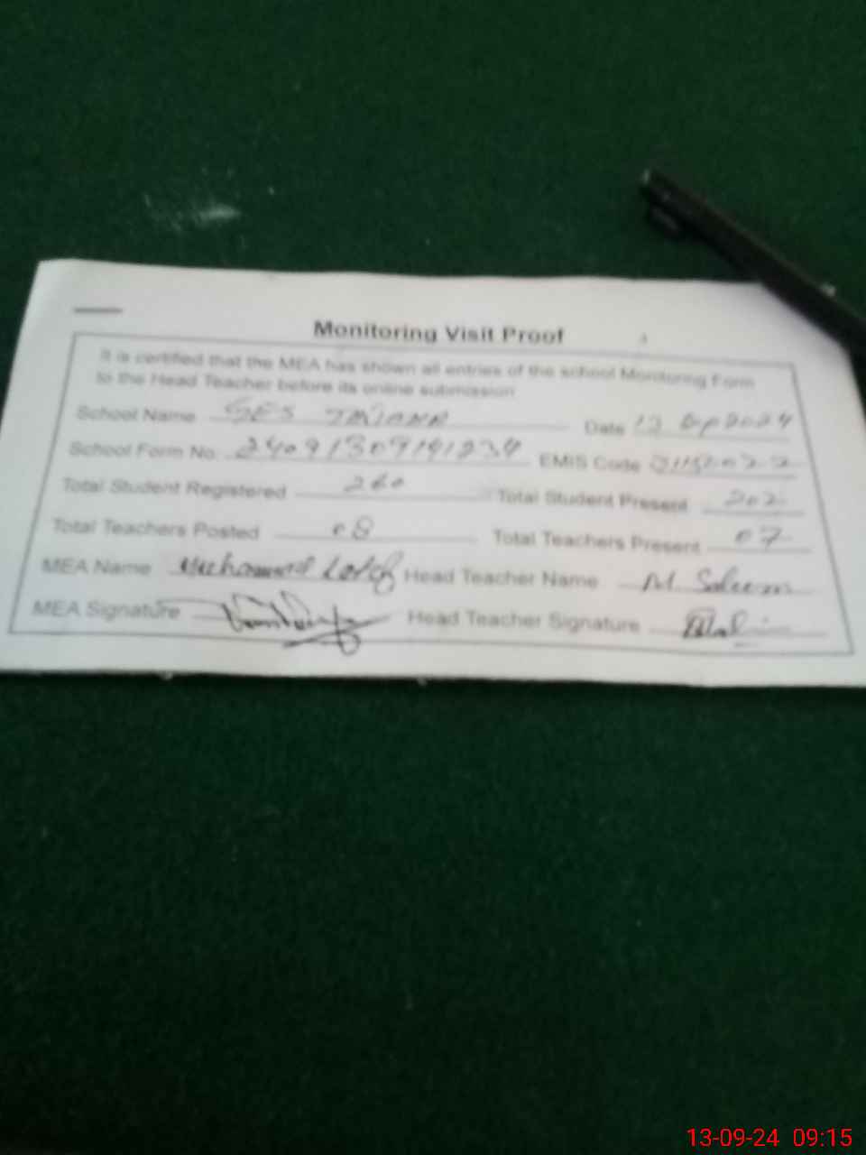 | Attendance Register | Head Teacher | MEA with School | Visit Proof |