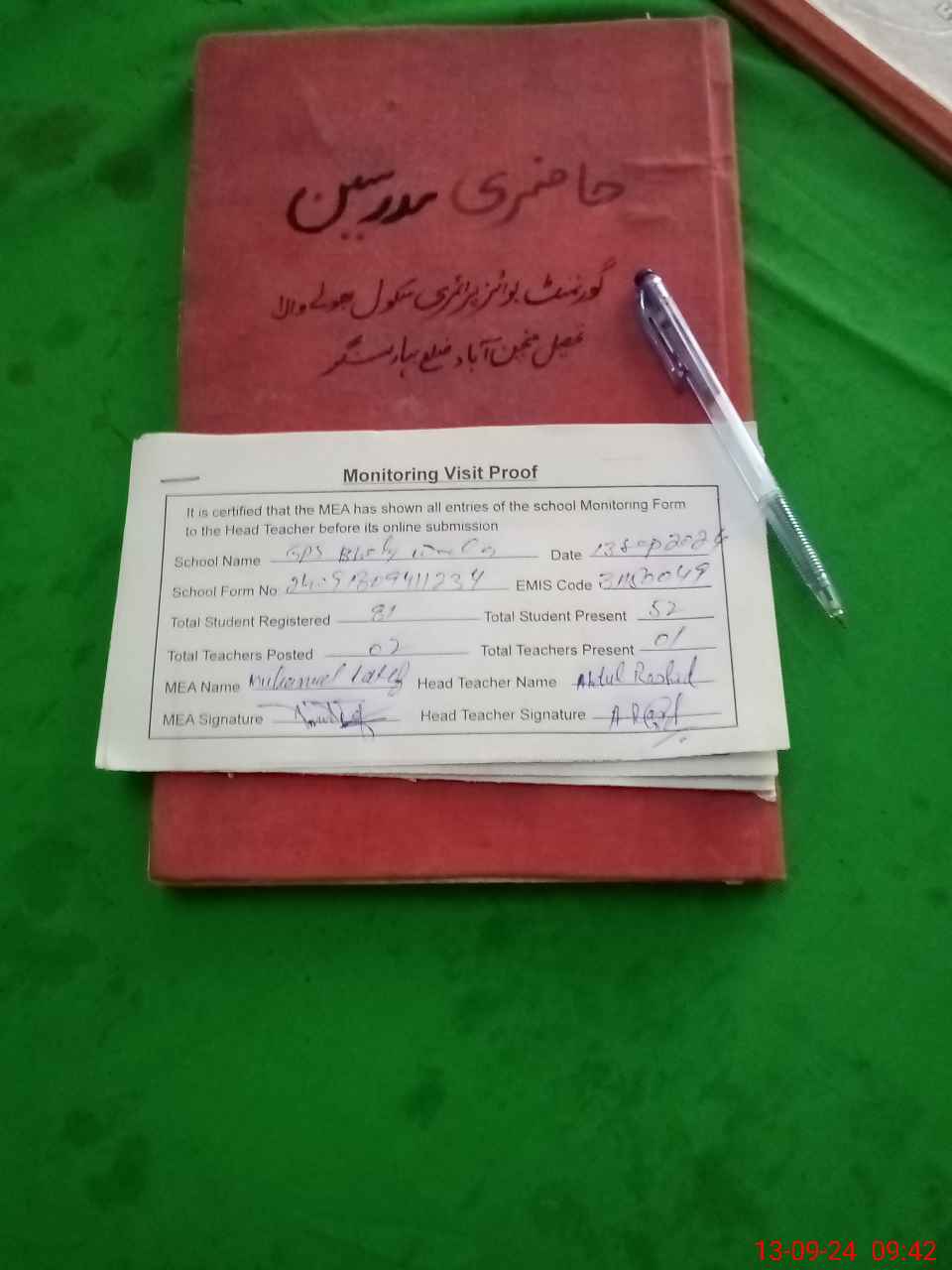 | Attendance Register | Head Teacher | MEA with School | Visit Proof |