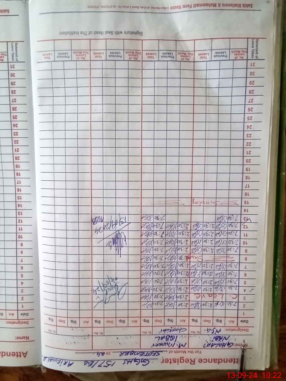 | CNIC | Full Name | Designation | R/C | Absence During Last Calender Month |