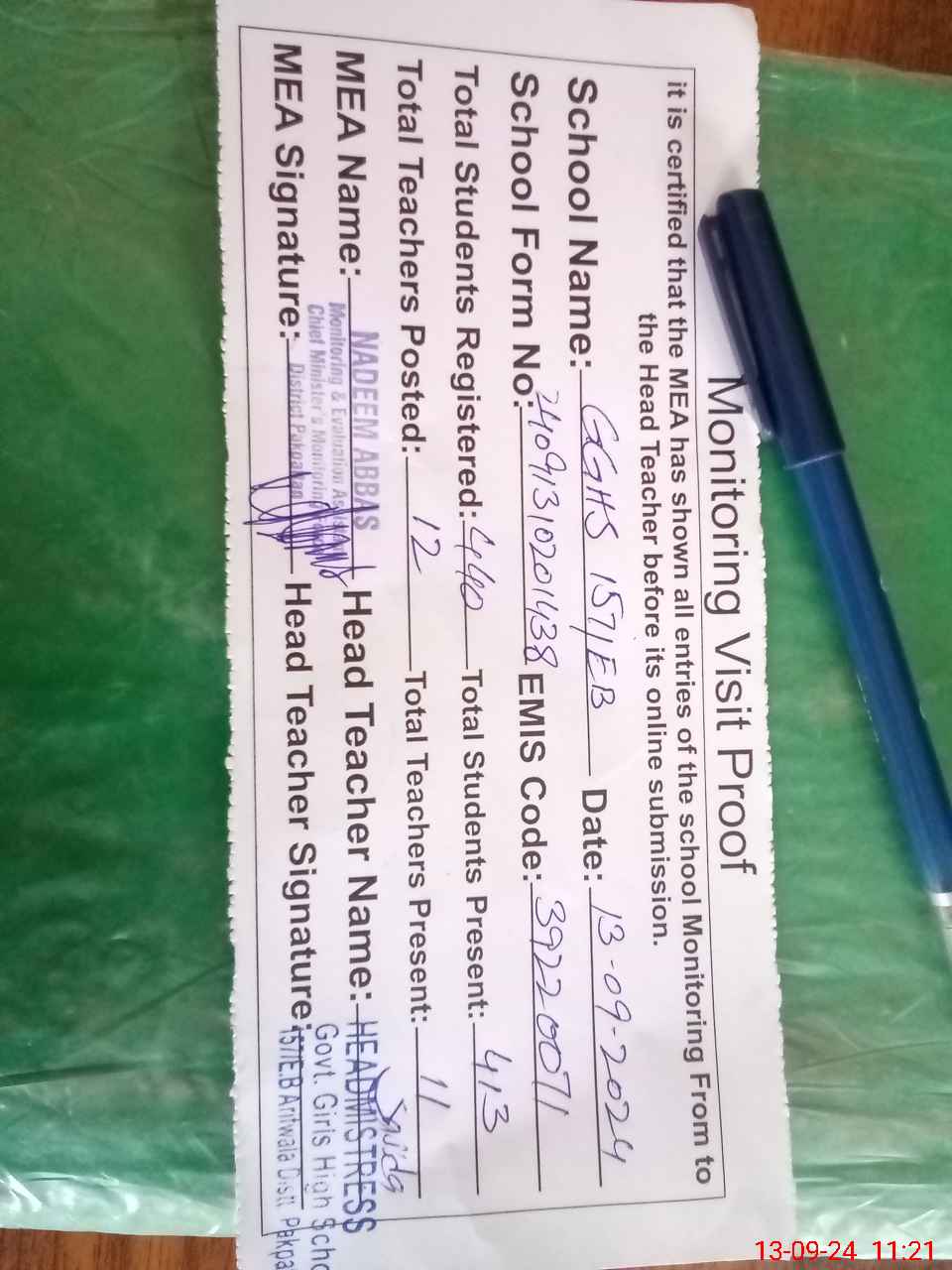 | Attendance Register | Head Teacher | MEA with School | Visit Proof |
