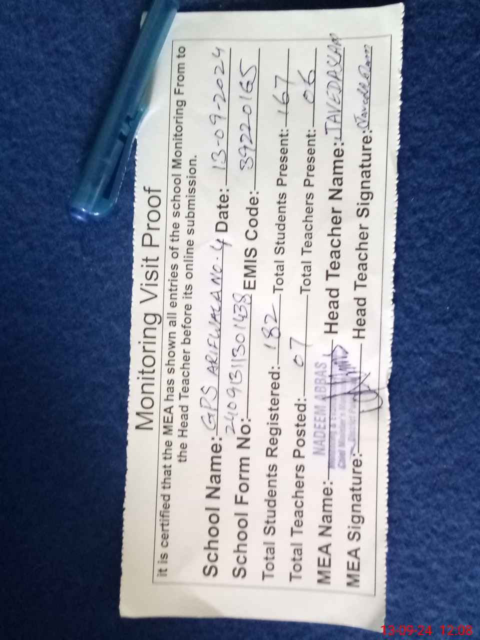 | Attendance Register | Head Teacher | MEA with School | Visit Proof |