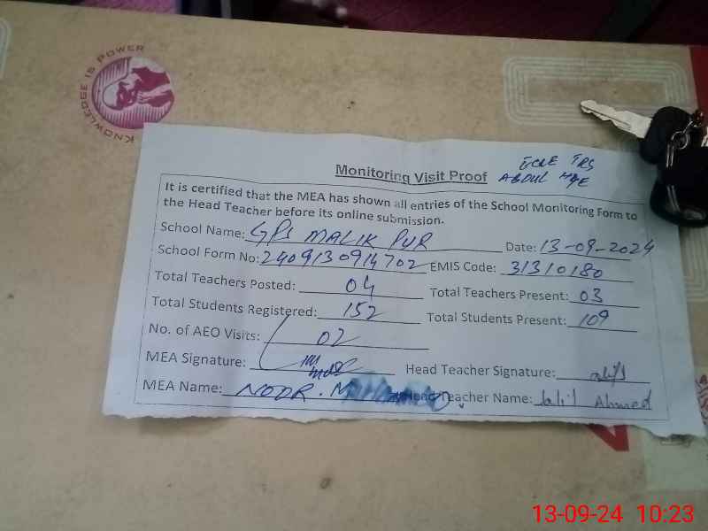 | EMIS Code: 31310180 | Name of School: GPS MALIK PUR (After Noon) | |||