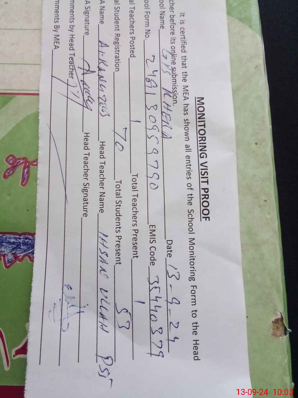 | Attendance Register | Head Teacher | MEA with School | Visit Proof |
