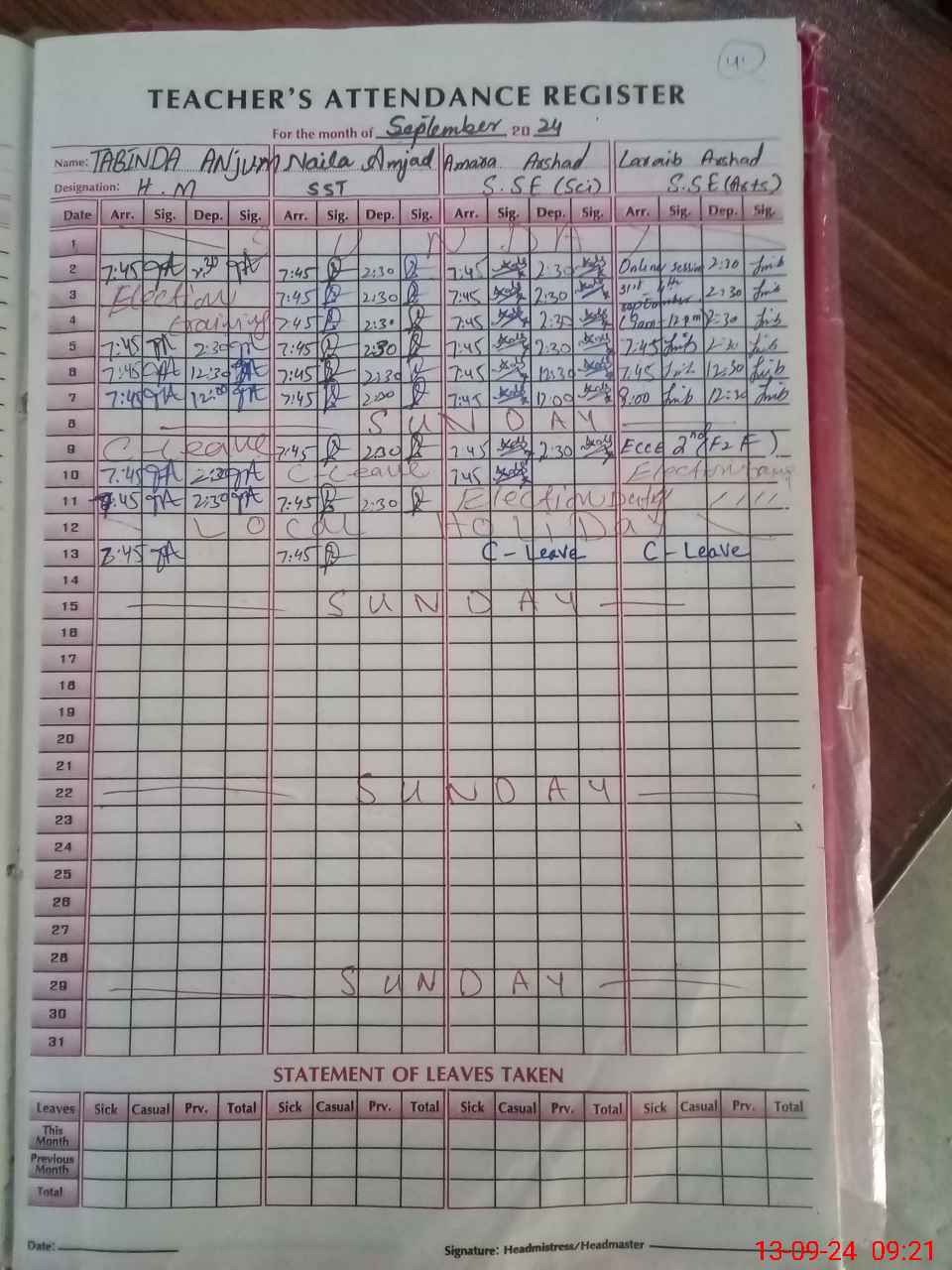 | Leave | Duty | Absent | Maternity | Medical | Ex- Pak |