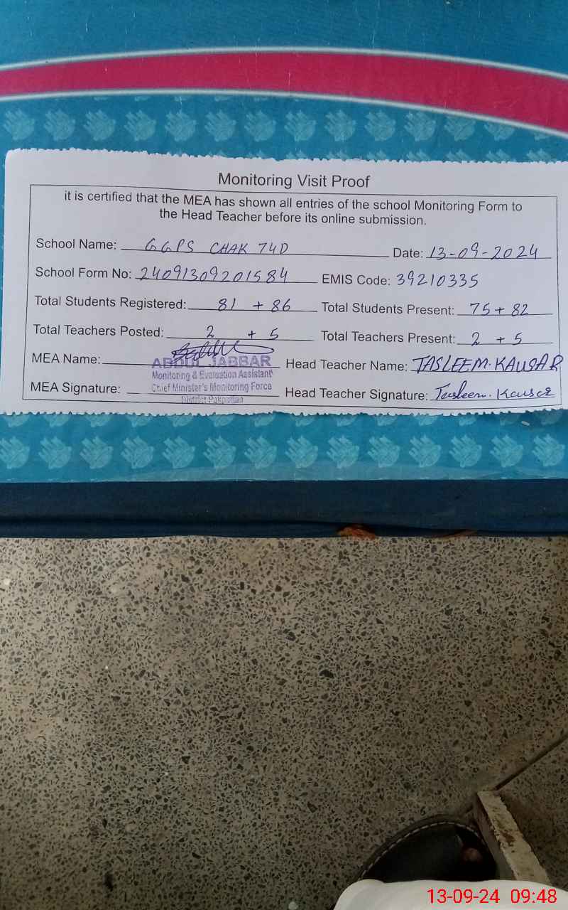 | EMIS Code: 39210335 | Name of School: GGPS CHAK 74/D | |||