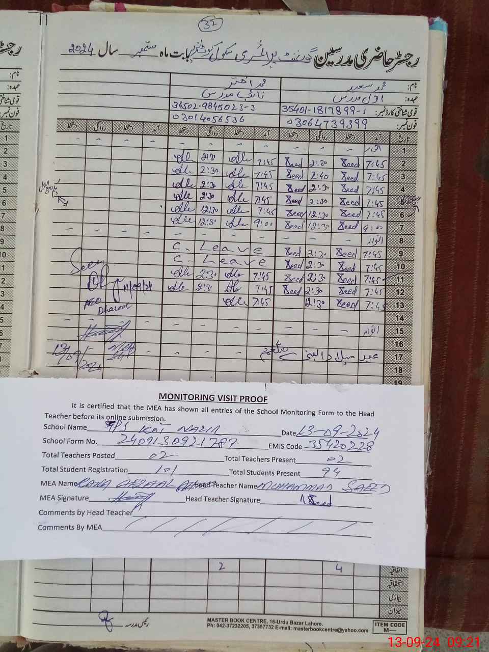 | Attendance Register | Head Teacher | MEA with School | Visit Proof |