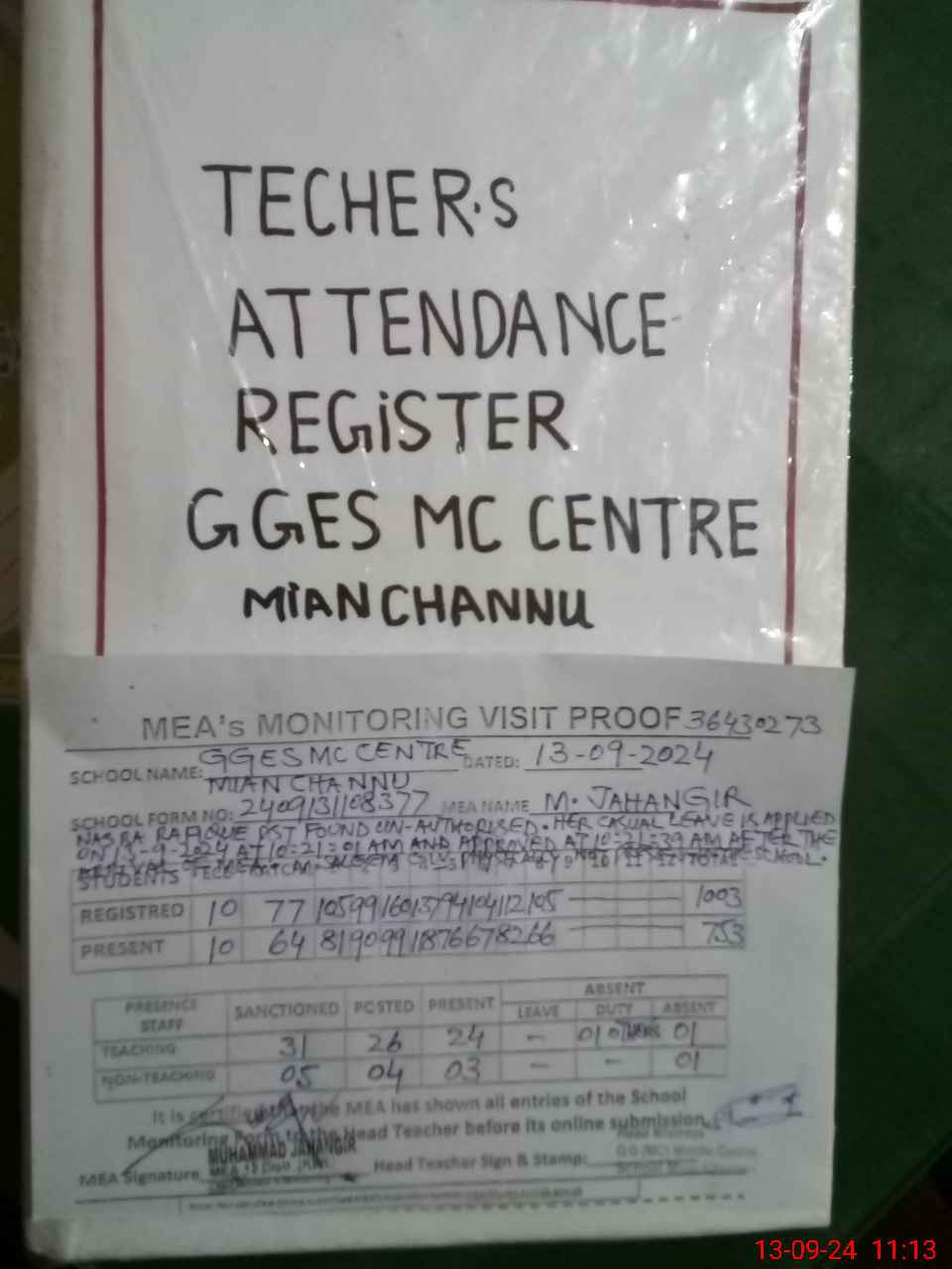 | Remarks (Use Separate Page if Required): NASRA RAFIQUE PST FOUND UN AUTHORISED HER CASUAL LEAVE IS APPLIED ON 13 SEPTEMBER 2024 AT 10 21 01 AM AND APPROVED AT 10 21 39 AM AFTER THE ARRIVAL OF MEA MUHAMMAD SALEEM CIV PHYSICALLY NOT PRESENT IN THE SCHOOL NSB GRANTS RECORDS ARE NOT MAINTAINED RANDOM CLASS TWO B IS NOW IN CLASS FIVE LESSON PLANS ARE NOT AVAILABLE GGES MC CENTRE MIAN CHANNU | |||||