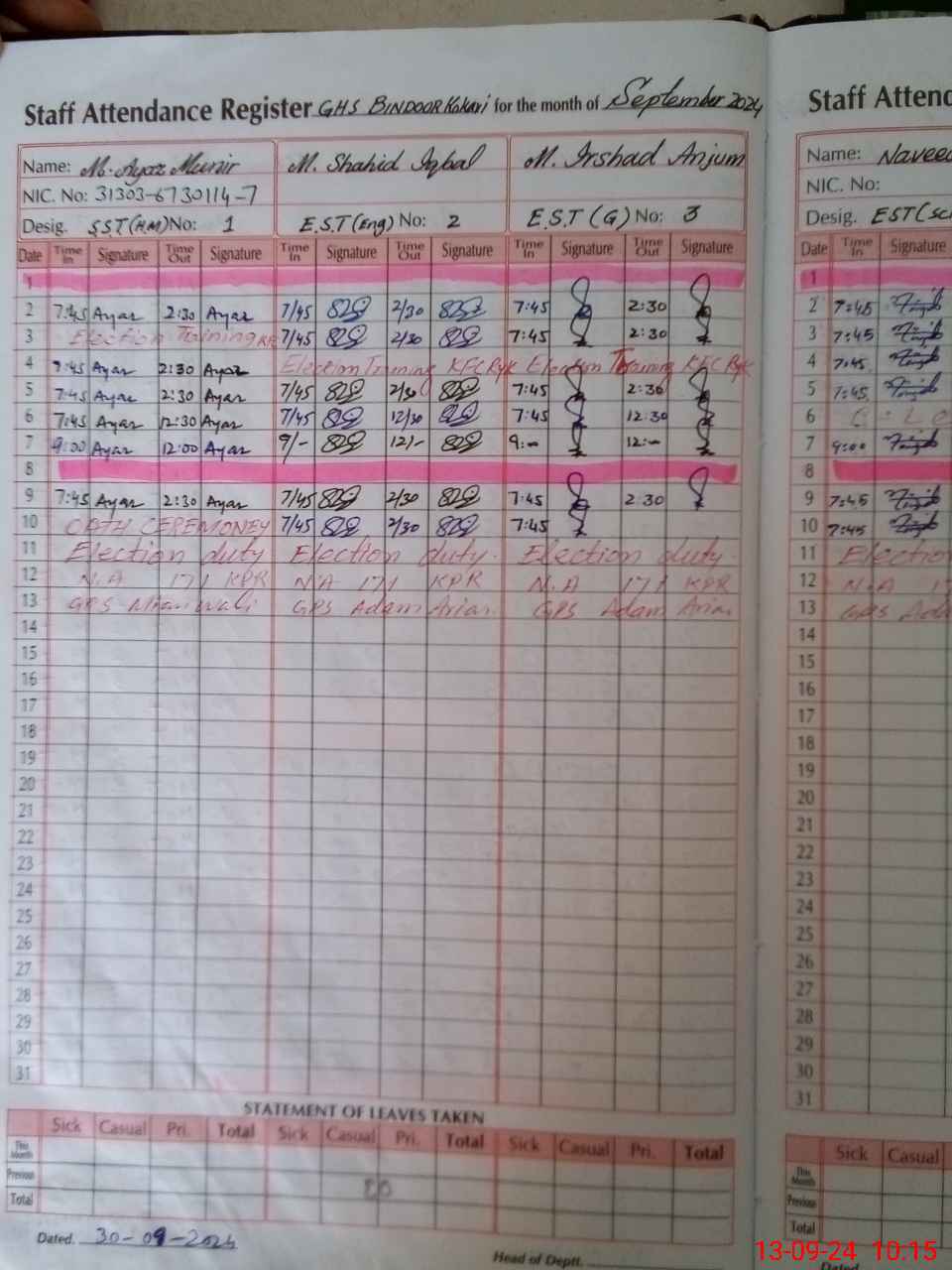 | CNIC | Full Name | Designation | R/C | Absence During Last Calender Month |