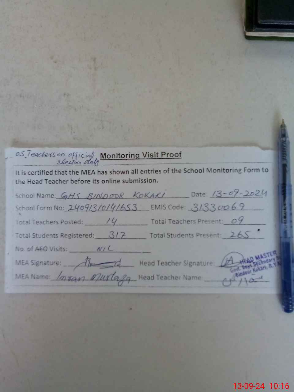 | Attendance Register | Head Teacher | MEA with School | Visit Proof |