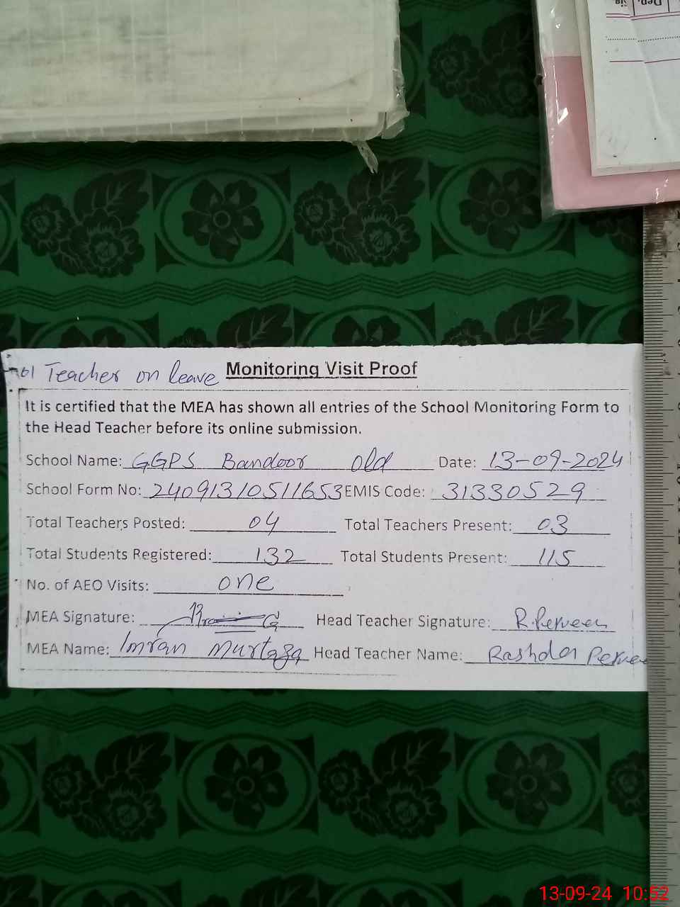 | Attendance Register | Head Teacher | MEA with School | Visit Proof |