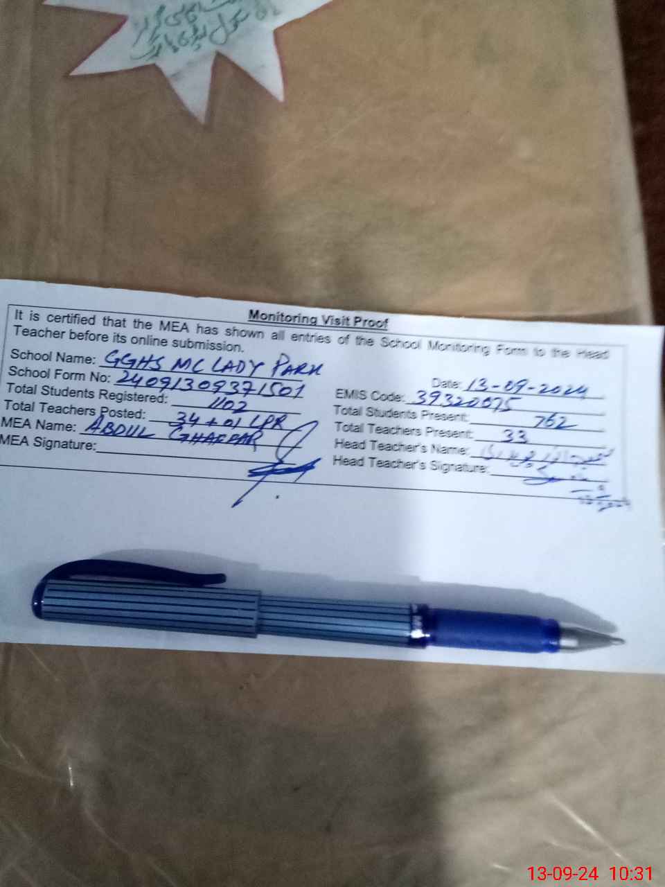 | Attendance Register | Head Teacher | MEA with School | Visit Proof |