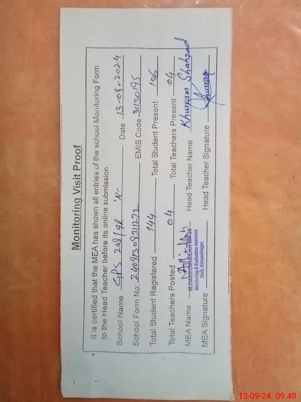 | Attendance Register | Head Teacher | MEA with School | Visit Proof |