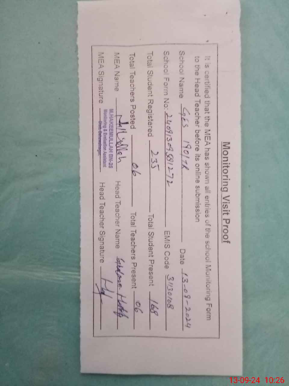 | EMIS Code: 31130108 | Name of School: GHS CHAK NO.190/7-R | |||
