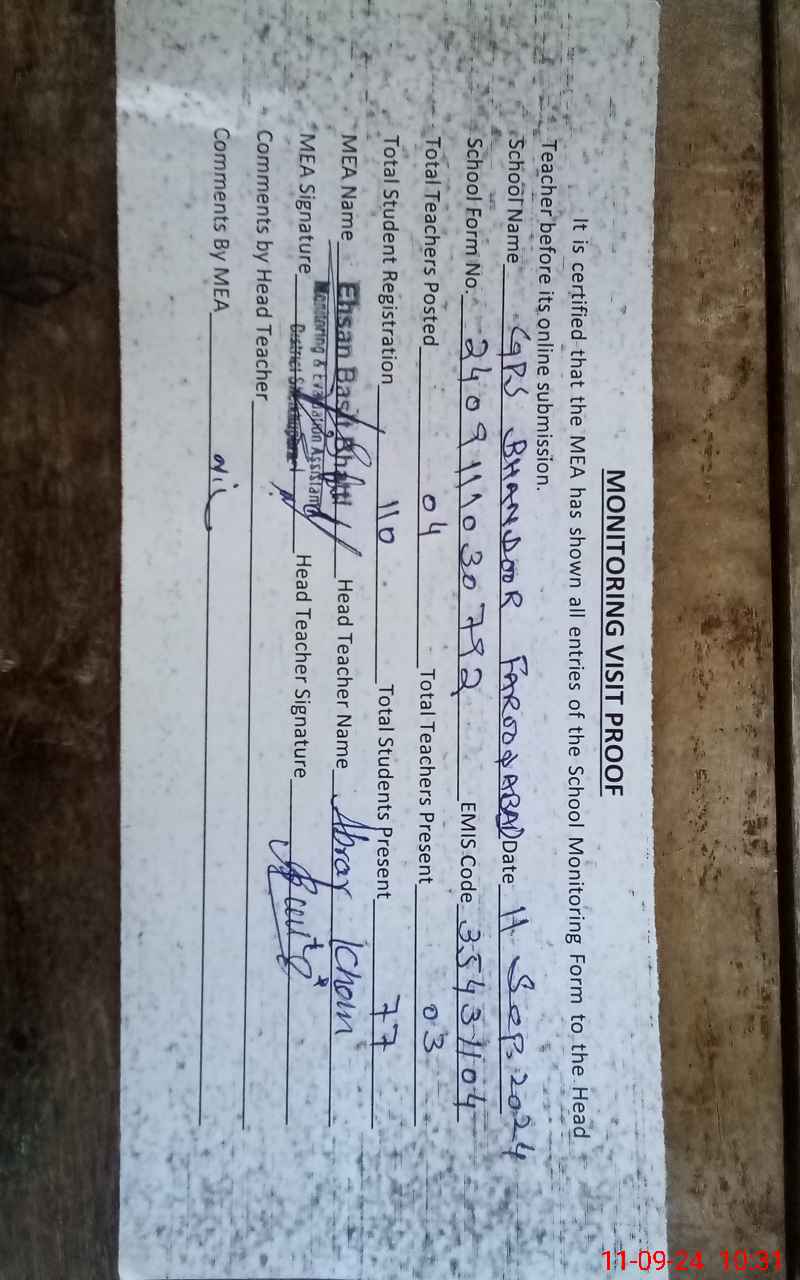 | EMIS Code: 35431104 | Name of School: GPS BHANDOOR FAROOQ ABAD | |||