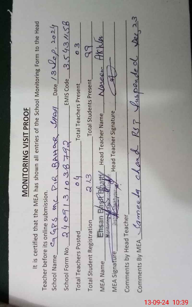 | EMIS Code: 35431158 | Name of School: GGPS MC PIR BAHAR SHAH | |||