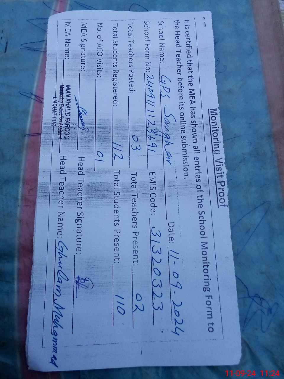 | Attendance Register | Head Teacher | MEA with School | Visit Proof |