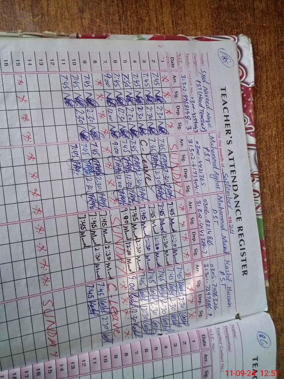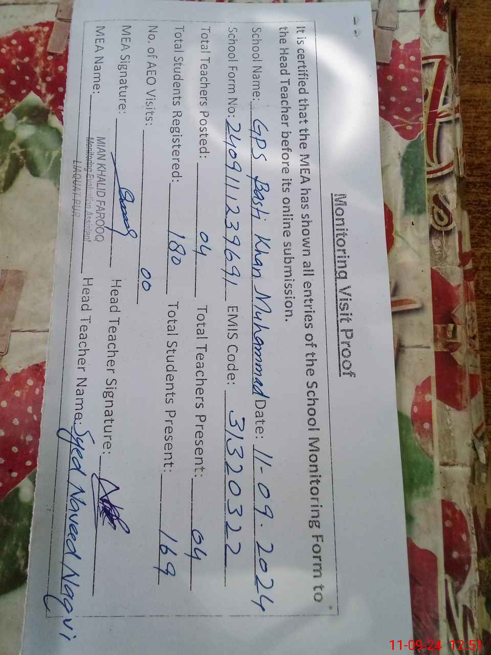 | Name: SY**** MU**** NA**** HU**** NA**** Designation: (School Headmaster's/Headmistress's) PST Phone/Cell Number: 03**** |