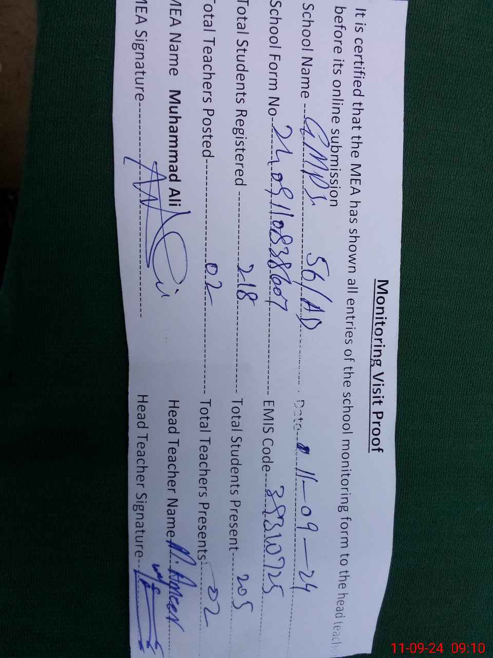 | Attendance Register | Head Teacher | MEA with School | Visit Proof |