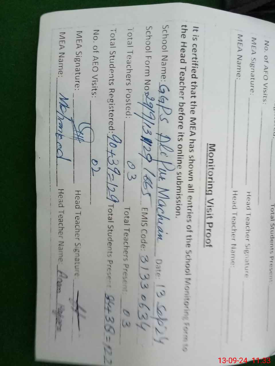 | Monitoring Date: 13-09-2024 | Start Time: 13-09-2024 10:54 AM | End Time: 13-09-2024 11:33 AM | Name of MEA: Ma**** UlHa**** | |
