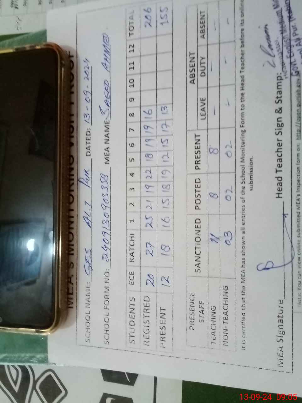 | Monitoring Date: 13-09-2024 | Start Time: 13-09-2024 08:23 AM | End Time: 13-09-2024 09:18 AM | Name of MEA: Sa**** Ah**** | |