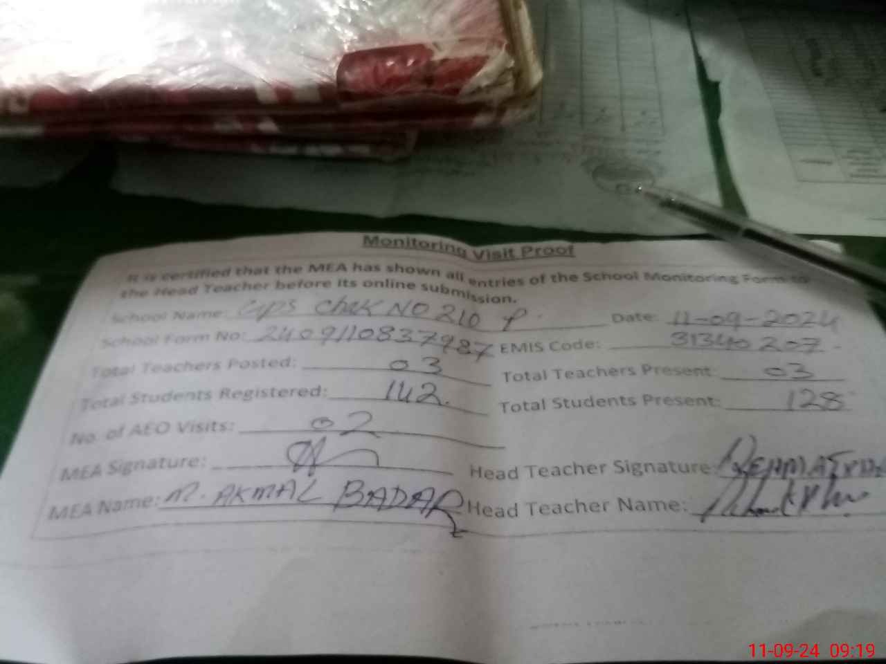 | Attendance Register | Head Teacher | MEA with School | Visit Proof |