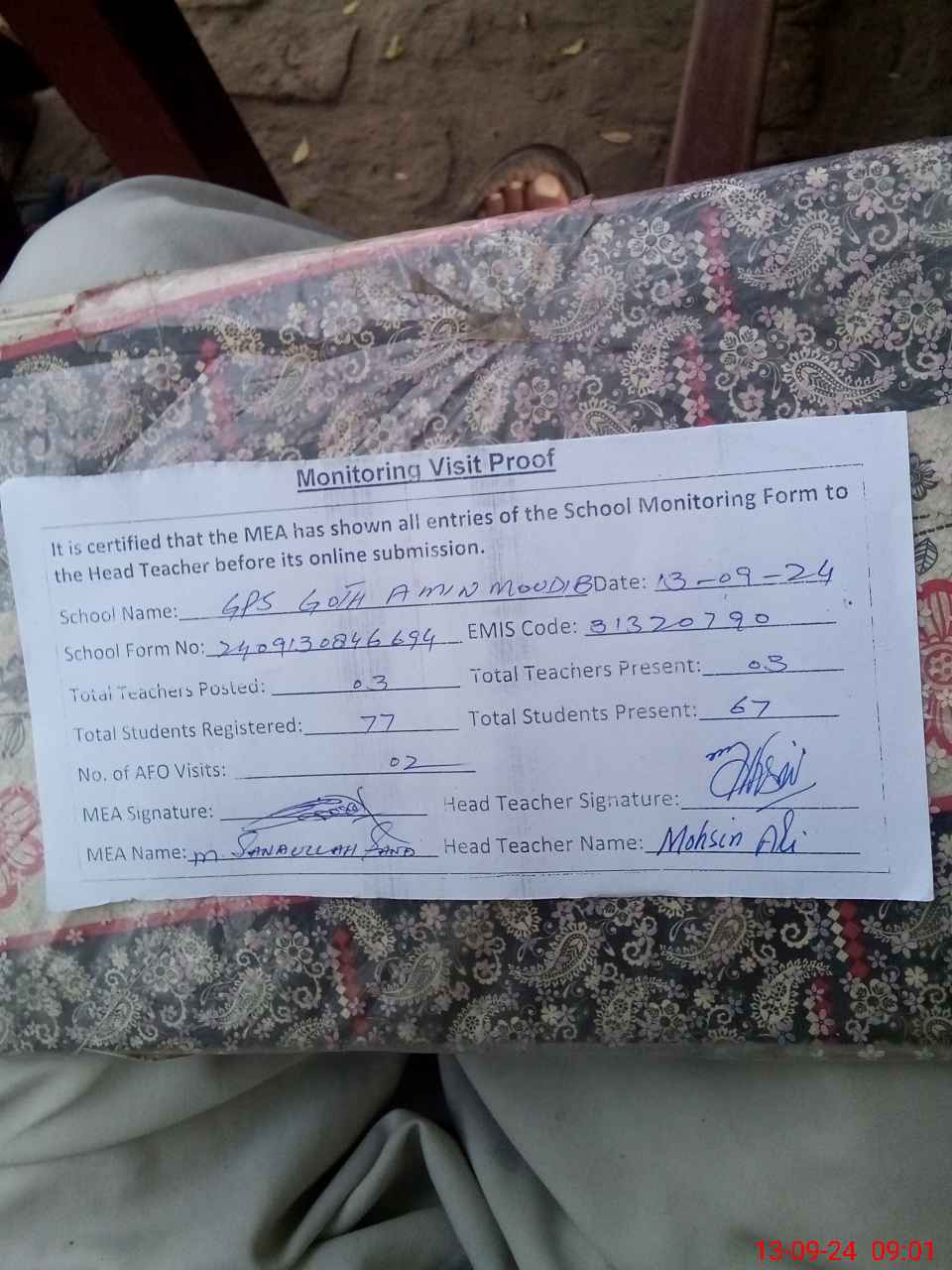 | Monitoring Date: 13-09-2024 | Start Time: 13-09-2024 08:33 AM | End Time: 13-09-2024 09:02 AM | Name of MEA: Mu**** Sa**** Ul**** Sa**** | |