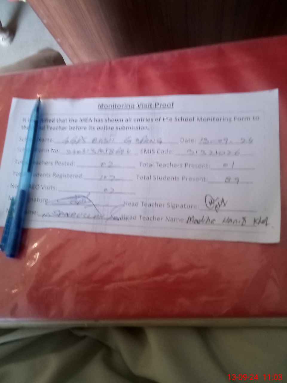 | Attendance Register | Head Teacher | MEA with School | Visit Proof |