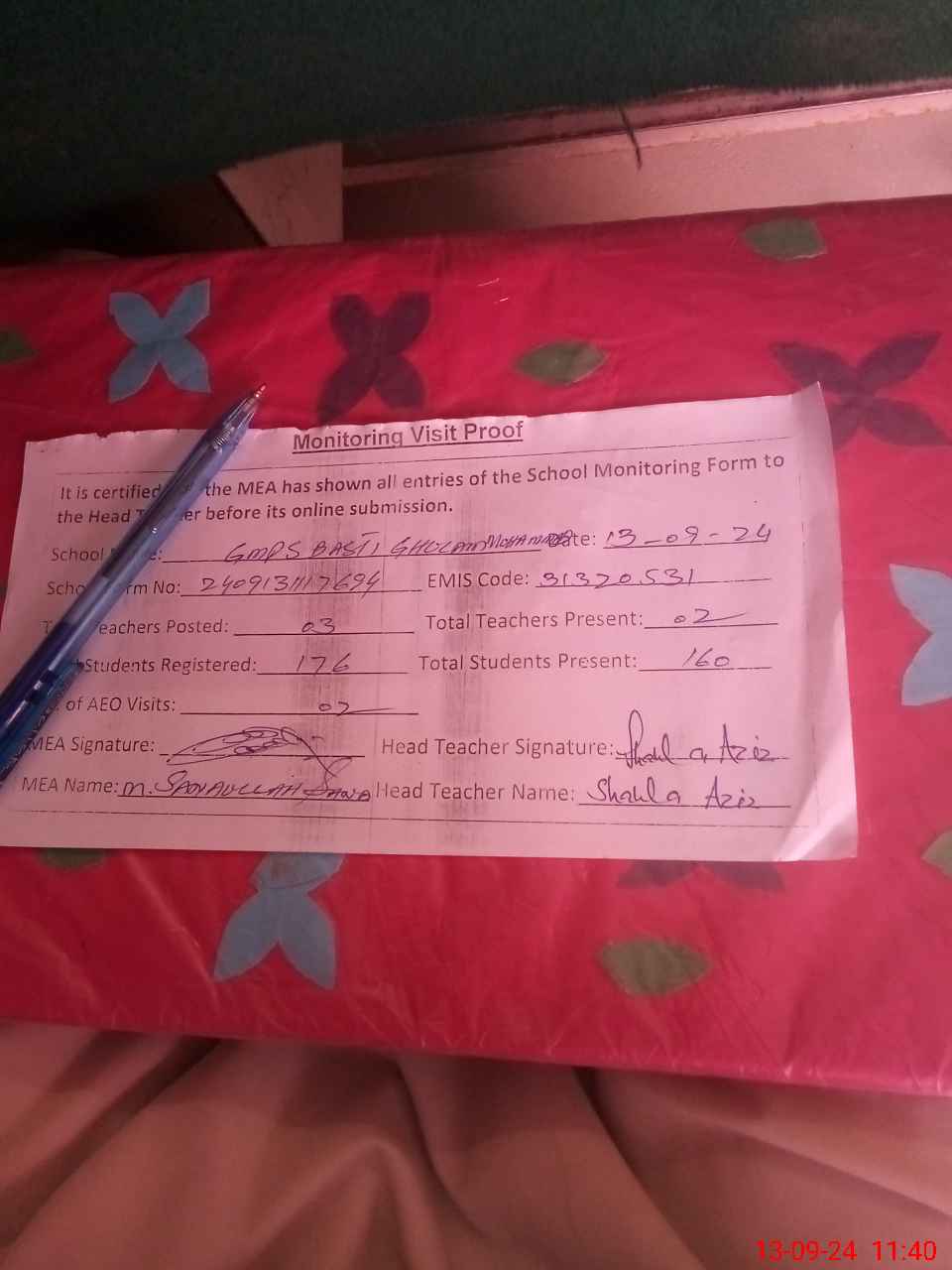 | Attendance Register | Head Teacher | MEA with School | Visit Proof |