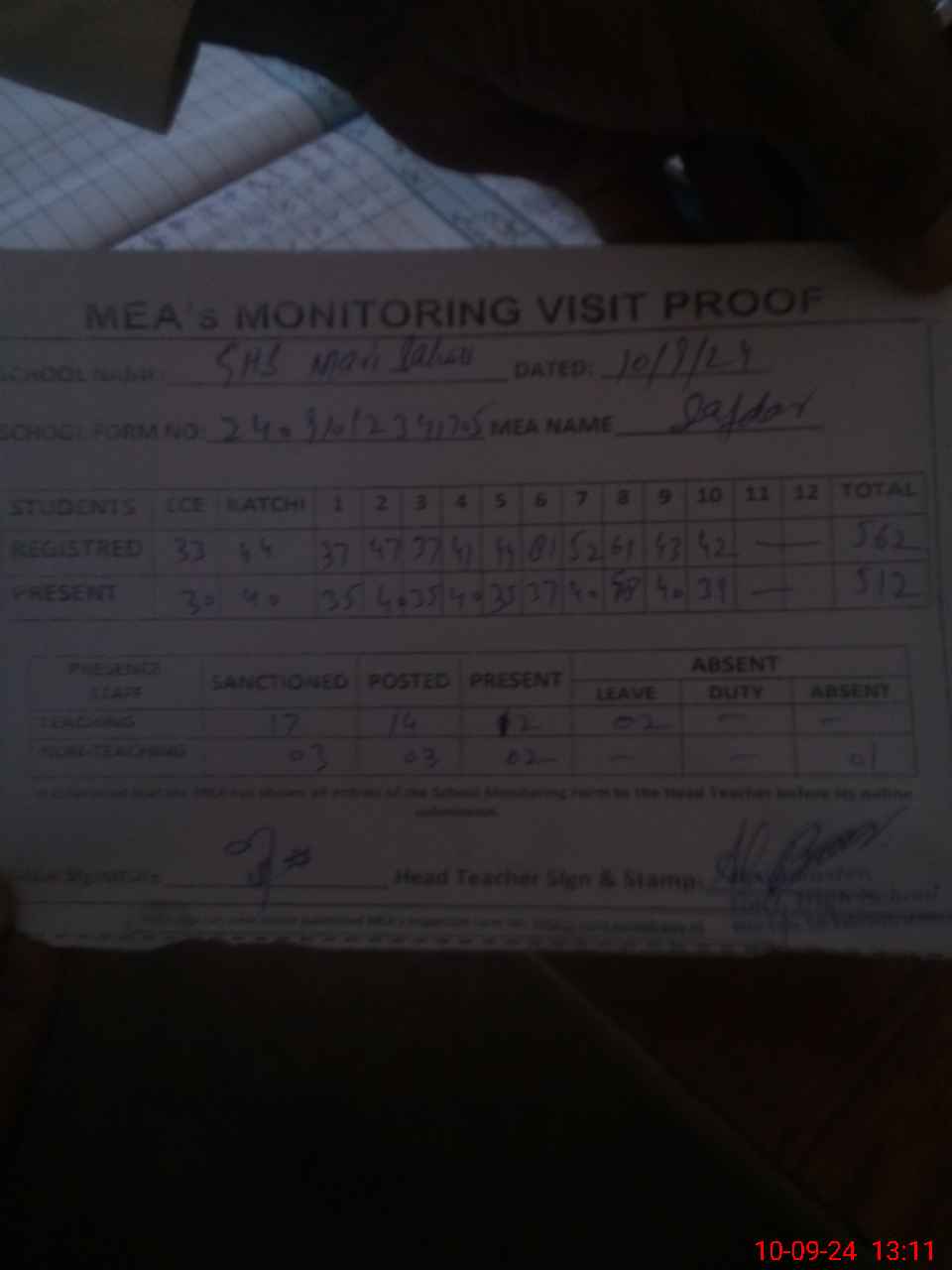 | Attendance Register | Head Teacher | MEA with School | Visit Proof |