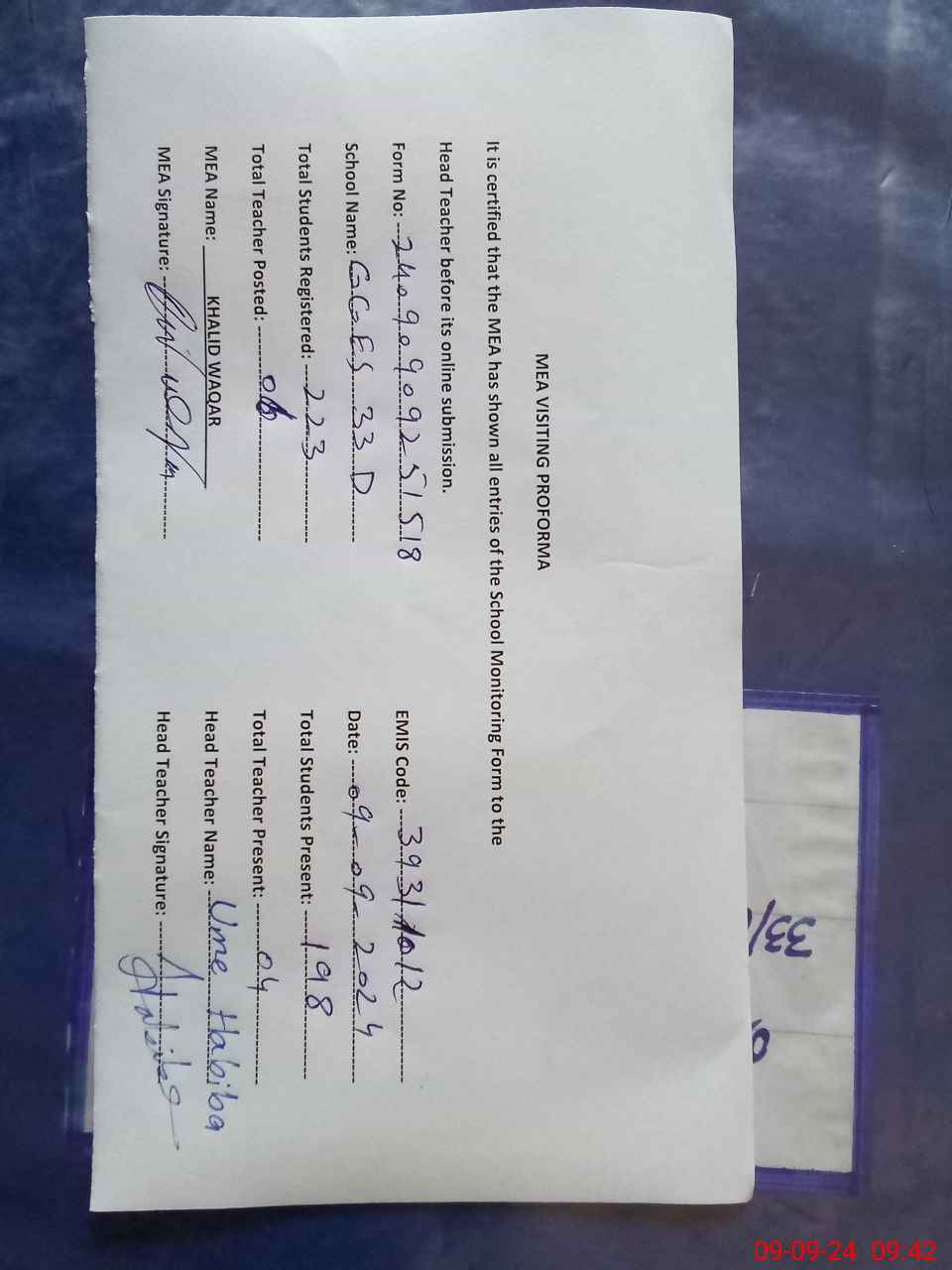| Attendance Register | Head Teacher | MEA with School | Visit Proof |