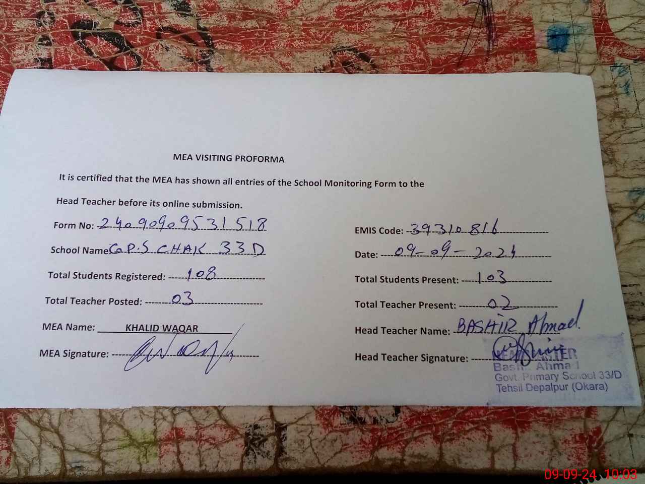 | Name: BA**** AH**** Designation: (School Headmaster's/Headmistress's) PTC/JV Phone/Cell Number: 03**** |