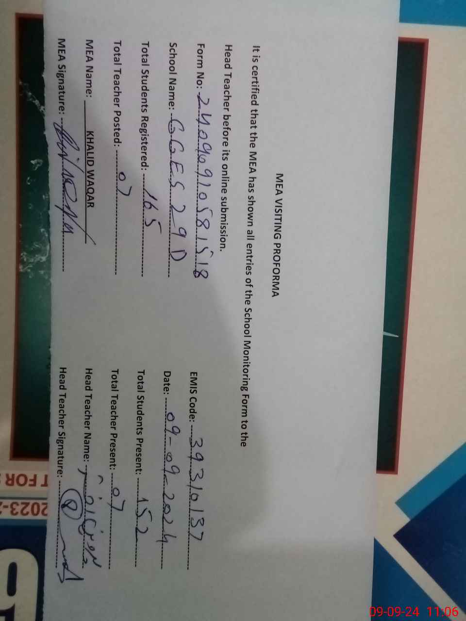 | Certified that this School was Inspected by the Undersigned MEA/DMO Today and the Information Stated Above is as Per Record. | |||||