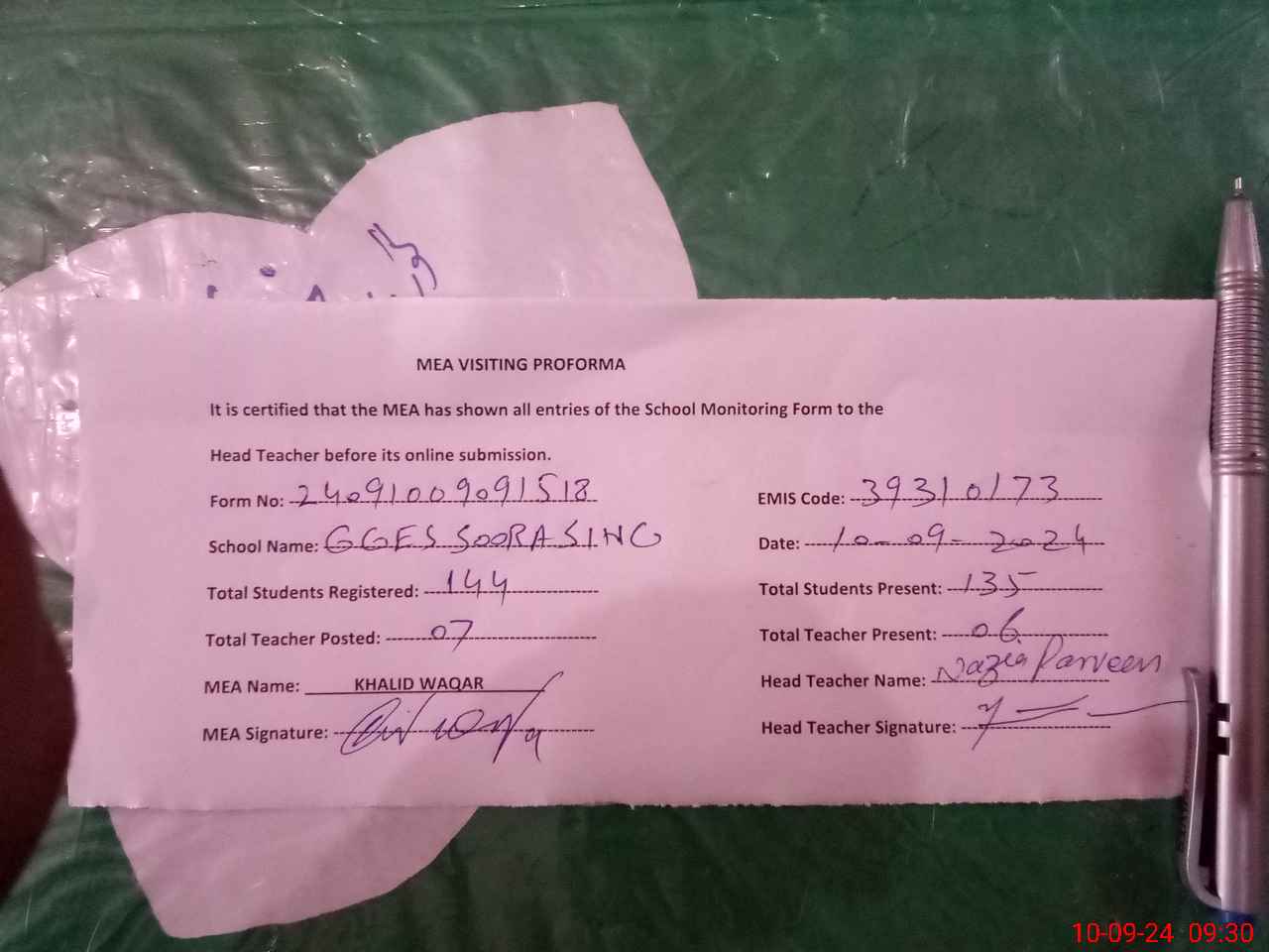 | Attendance Register | Head Teacher | MEA with School | Visit Proof |