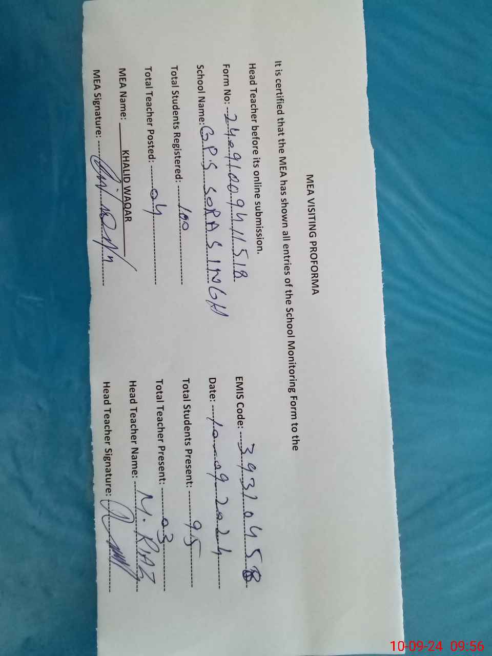 | Monitoring Date: 10-09-2024 | Start Time: 10-09-2024 09:39 AM | End Time: 10-09-2024 10:22 AM | Name of MEA: KH**** WA**** | |