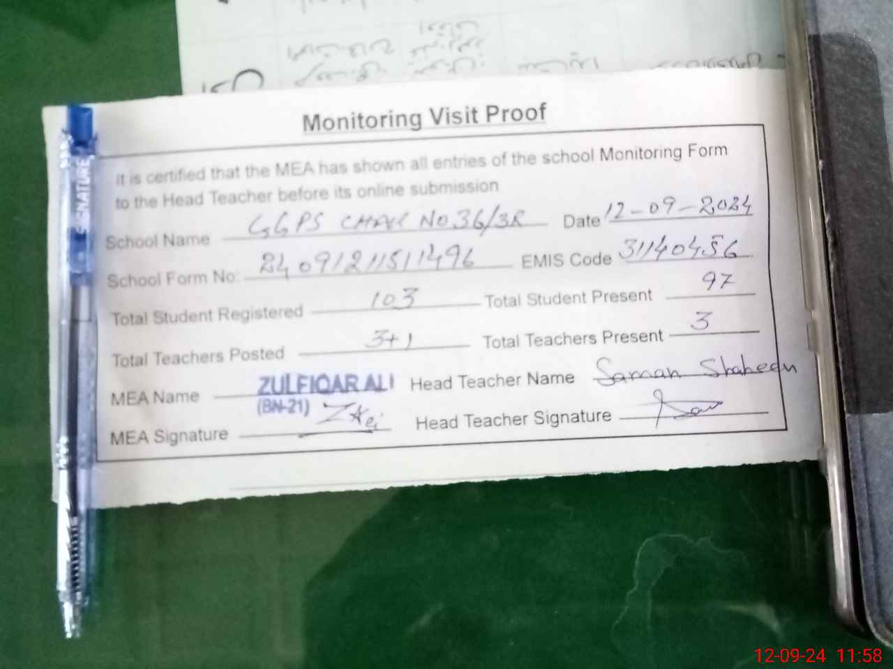 | Attendance Register | Head Teacher | MEA with School | Visit Proof |